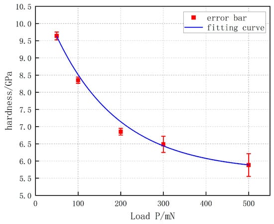 As shown in Table 1, the hardness values corresponding to the average results from three experiments for each load of 50 mN, 100 mN, 200 mN, 300 mN, and 500 mN are 9.64 GPa, 8.35 GPa, 6.85 GPa, 6.49 GPa, and 5.88 Gpa. As shown in Figure 6, with the increase in load, the pressing depth becomes deeper, and the hardness of the material gradually decreases. It can be seen that there is a size effect of silicon-modified Sic [15]. Through data fitting, it is found that the hardness decreases exponentially with the increase of applied load. The relationship between the hardness and load is described as follows: