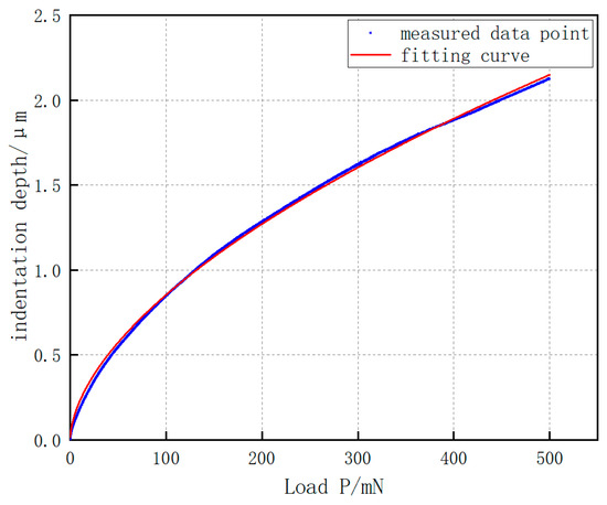 The relationship between the indentation depth and load during the hardness test, as shown in Figure 7, reveals that there is no fluctuation in the load curve within the indentation range of 0–500 mN. When the maximum indentation load reaches 500 mN, the curve demonstrates excellent continuity. With increasing load, the indentation depth of brittle materials exhibits a power-law growth, and the relationship between the indentation depth and load is as follows: