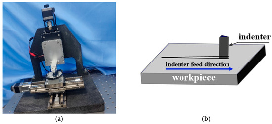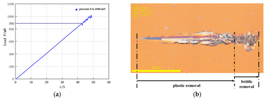As shown in Figure 9a, the experimental equipment for the nanoscratch tests included a nanoindenter with a standard Vickers indenter. The load range was 1–1000 mN with a load resolution of 30 μN, and the noise level was less than 0.1 mN. The goal of the nanoscratch experiment was to find the critical point of the material’s brittle-to-plastic transition and determine the critical load for this transition. This critical load was then used in Equation (3) to calculate the critical depth for plastic zone removal. During the experiments, the nanoscratch tests were performed on different regions of the sample surface at loading speeds of 2 mN/s, 4 mN/s, 6 mN/s, 10 mN/s, 16 mN/s, and 20 mN/s (corresponding to maximum loads of 100 mN, 200 mN, 300 mN, 500 mN, 800 mN, and 1000 mN). The scratch speed was 10 µm/s, and the scratch length was 500 µm. Indenter tip feed direction is shown in Figure 9b. The normal force gradually increased. To ensure the reliability and repeatability of the experimental data, each indentation was performed three times.