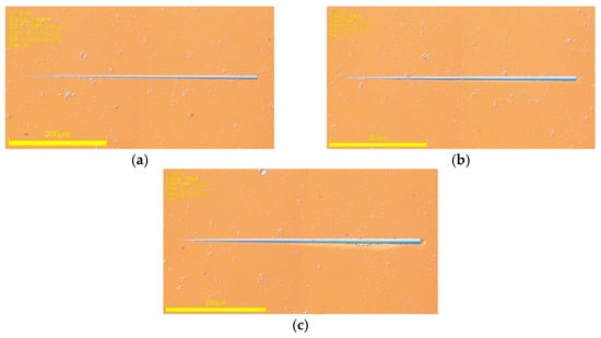 Image of scratches under an optical microscope: (a) 0–100 mN, (b) 0–200 mN, and (c) 0–300 mN.