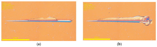 Figure 11a,b are scratch morphology images corresponding to load ranges of 0–500 mN and 0–800 mN, respectively. From these images, it can be observed that as the scratching process progresses and the load gradually increases, the scratch depth further increases. The material’s surface clearly exhibits signs of plastic pile-up without the presence of debris. At this point, the removal mechanism on the material’s surface begins to transition from plastic removal to brittle removal. The surface of the silicon-modified Sic is now in a state of coexisting plastic and brittle removal.