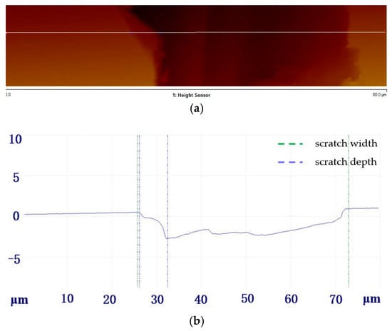 Scratch depth image under an atomic force microscope: (a) atomic force morphology image and (b) scratch depth curve.