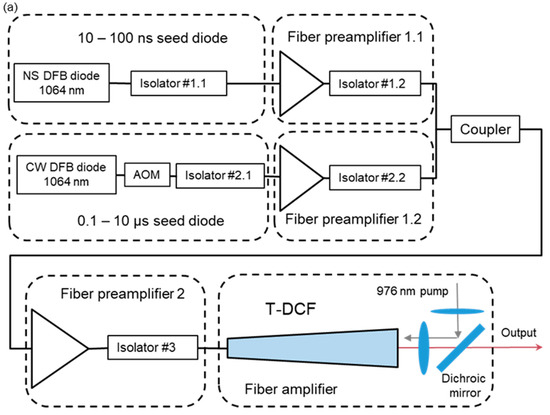 The pulse repetition rate for both seed sources was set at 10 kHz. The outputs from each seed source were amplified by single-stage single-mode ytterbium-doped fiber amplifiers (YDFA) 1.1 and 1.2 (Figure 1a) pumped at 976 nm. The dual-seed diode configuration allowed optimization of the first fiber amplification stages for their respective pulse duration ranges. At the input of the second preamplifier, the pulse energy was approximately 1 μJ for the entire pulse duration range.