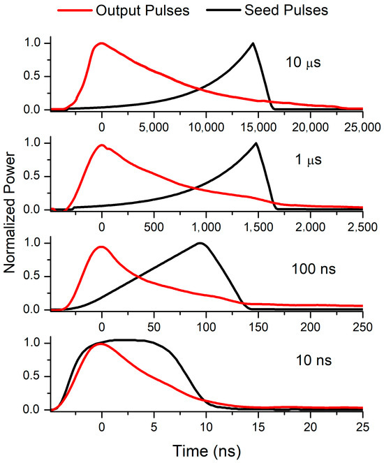 The maximum energy of pulses with a duration of 1 and 10 μs is almost the same, while for pulses with a duration of 10 and 100 ns, it differs. We attribute this to the fact that different shapes of the driving pulse were used to compensate the gain drop at the trailing edge of the pulse. Figure 2 shows the pulse shape from the seed source before the preamplifiers and the pulse shapes of the outgoing pulses.