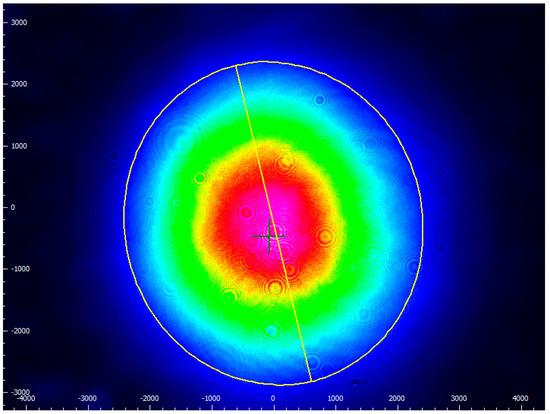 Beam quality measurements were conducted using a Thorlabs M2 Measurement System [13]; the measurement results are presented in Table 2. The calculation of the M2 parameter was carried out by the built-in device software; the output beam has an M2 value of 1.2 with a diameter of 3 mm at the 1/e2 intensity level, a Gaussian profile, and a residual divergence of 1 mrad. The profile of the resulting beam is shown in Figure 3.
