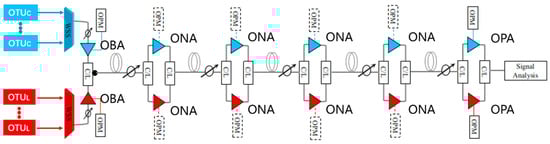 Simulation setup of the C6T and L5T transmission system. OTUC/L: optical transform unit, C/L: C and L wavelength combiner, OBA: optical booster amplifier, ONA: optical node amplifier, OPA: optical pre-amplifier, OPM: optical power monitor, WSS: wavelength selective switch.