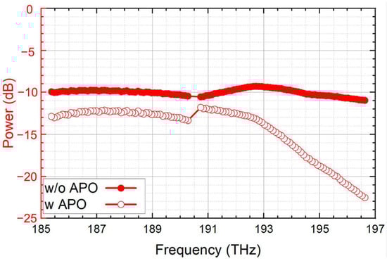 Power spectrum at the receiver side after 5-span G.654.E fiber transmission with and without the APO scheme.