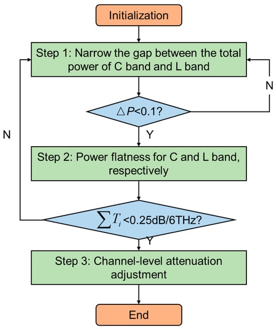 where ΔP is the received optical power difference between the C band and L band of every span, and N is the number of fiber spans. Step 1 needs to be iterated until ΔP < 0.1, as the SRS-induced power transfer will affect the adjusted results.