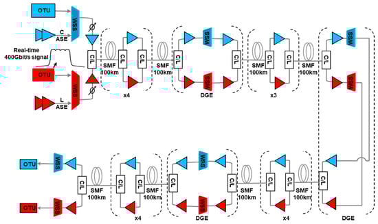 The experimental setup is shown in Figure 5. At the transmitter side, 110 DWDM channels spaced by 100 GHz consist of 60 C band and 50 L band wavelengths. In the C band, one channel is filled with a 400 Gbit/s real-time signal with a symbol rate of 91.6 GBaud. The 400 Gbit/s real-time signal is realized with probabilistic constellation shaping (PCS) and polarization-division-multiplexed 16-point quadrature-amplitude modulation (PDM-16QAM). The remaining 59 channels are loaded with amplified spontaneous emission (ASE) noise, which is spectrally shaped by the concatenation of two EDFAs. The 400 Gbit/s signal and the 59 loading channels are multiplexed using a 6 THz widened C band WSS and then amplified using an EDFA. In the L band, similar to that of the C band configuration, the 50 channels consist of one 400 Gbit/s real-time signal and 49 loading channels. Thus, the total capacity is 44 Tbit/s (400 Gbit/s × 110 = 44 Tbit/s). The WSSs and EDFAs in the C band can support 48 nm optical bandwidth, ranging from 1524.4 nm to 1572.3 nm, and those of the L band can support 43.2 nm optical bandwidth, ranging from 1575.2 nm to 1618.4 nm. The C band multiplexed signals and the L band multiplexed signals are coupled and then sent to the fiber transmission link.