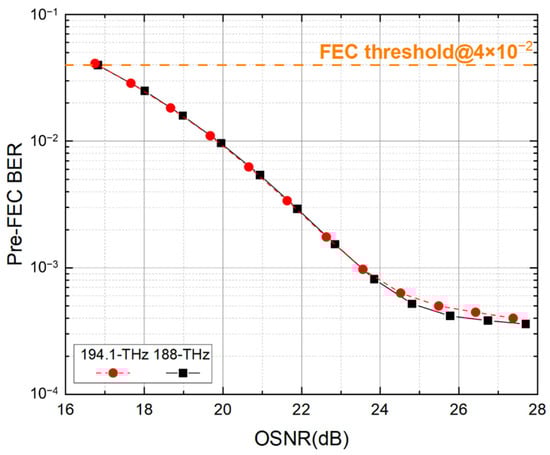 First, we investigate the required OSNR of the 400 Gbit/s signal at the C band and L band in the B2B case. The BERs before forward error correction (FEC) at different wavelengths in the C band and L band versus OSNR are shown in Figure 6. The results indicate that the required OSNRs at the C and L bands are almost the same. The required OSNRs are 17 dB at the FEC threshold (BER of 4×10−2).