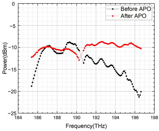 The optical power spectra before and after the APO scheme at the first OMS are recorded, as shown in the black and red lines of Figure 7, respectively. It can be observed that the maximum channel power of the high-frequency part of the C band is 9.4 dB less than the minimum channel power of the low-frequency part when APO is not implemented, which is mainly caused by the SRS effect and results in bad performances at short wavelengths. Meanwhile, the low-frequency part of the L band has low power, which is different from the simulation, mainly caused by the uneven gain of the L band EDFAs used in the experiment. The L band OAs have lower gains in the lower frequency part, as shown in Figure 8. Moreover, the unevenness within the C band and L band is also due to the unevenness of the gain spectrum of the optical amplifier. After OMS power adjustment, the intra-band flatness of the C band and L band is clearly improved, from 9.4 dB to 2 dB for the C band and from 10 dB to 3 dB for the L band. In addition, the power flatness is modified from 12 dB to 4 dB over the entire 11 THz bandwidth, which shows the high efficiency of the OMS-based APO algorithm.