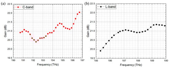 The gain spectrum of optical amplifiers for (a) the C band and (b) the L band.