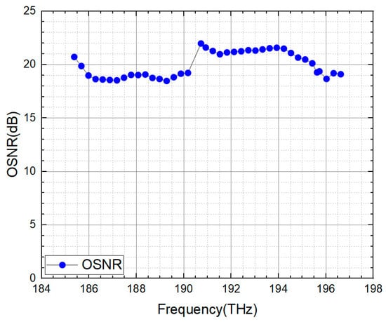 Finally, the OSNR of all channels is measured across the widened C band and L band with APO, and the results are depicted in Figure 9. The received OSNR can be kept relatively flat (3.4 dB) across the 11 THz bandwidth, while the average OSNR of the C band has 1.73 dB improvement compared to that of the L band. The long-term Q-factor performance for the C band and L band after the transmission is tested, as shown in Figure 10, by capturing the pre-FEC BERs at typical channels in both the C and L bands from the optical modules every 5 s and calculating the corresponding Q-factors. The results indicate that a very stable performance can be maintained over more than 1 h with almost less than 0.1 dB Q-factor fluctuations.