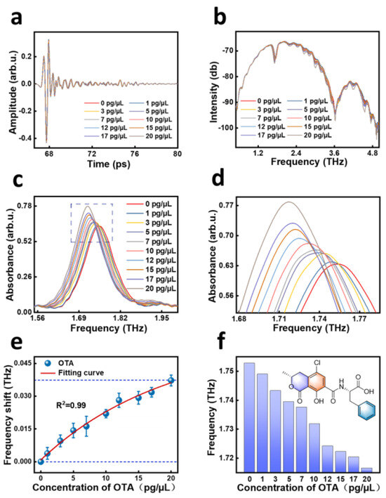 THz time-domain spectra (a), frequency-domain spectra (b), absorbance spectra (c), partial amplified absorbance spectra of dotted box in (c,d), corresponding frequency shift as a function (e), and column chart of the corresponding frequency shifts (f) of different OTA concentrations in acetonitrile.