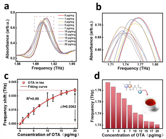 Absorbance spectra (a), partial amplified absorbance spectra of dotted box in (a,b), corresponding frequency shift as a function (c), and column chart of the corresponding frequency shifts (d) of different OTA concentrations in black tea.