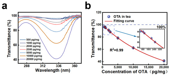 Transmittance spectra (a) and transmittance as a function (b) of different OTA concentrations in black tea (the inset shows the low-concentration part).