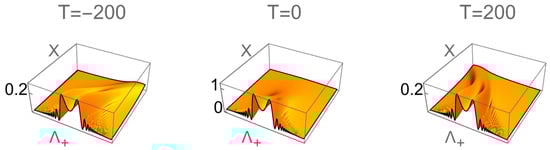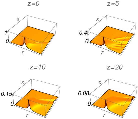 Figure 5 shows surface plots of the modulus of the wave packet versus and for four values of .