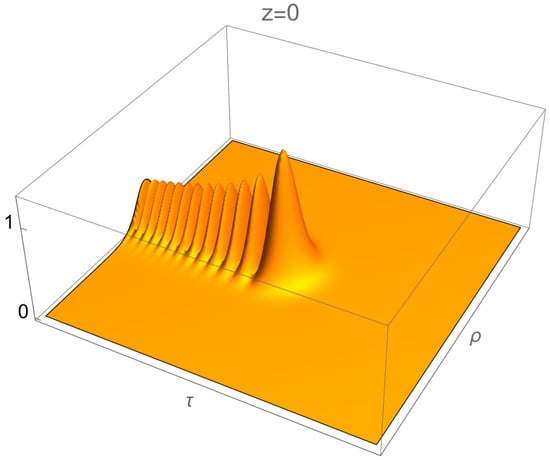 This is a finite-energy accelerating Airy–Gaussian wave packet. Figure 3 shows the intensity versus and at for . Figure 4 shows surface plots of the modulus of the azimuthally symmetric wave packet versus and for three values of .