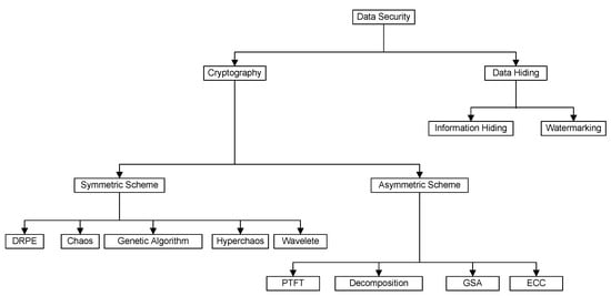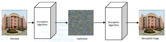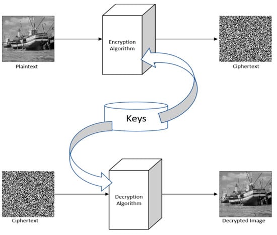 As we have discussed in the previous sections, in symmetric cryptosystems, encryption and decryption keys are the same and do not depend on the plaintext [,,,,,]. An illustration of this can be seen in the flowchart given in Figure 5. The DRPE architecture falls in the category of symmetrical algorithms. Besides that, various other symmetric methods have also been reported in the literature, which are discussed in the following sections.