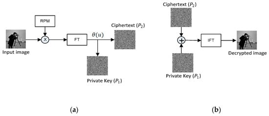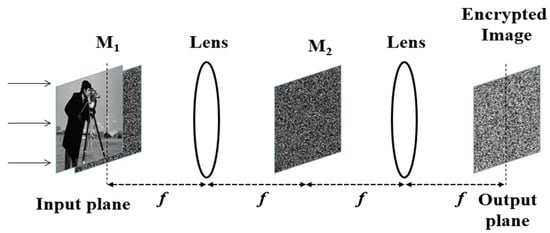 The seminal work in the field of optical image encryption was proposed by Refregier and Javidi in 1995, which is well known as double random phase encoding (DRPE) []. It was the first attempt to encode the information using optical methods in which a 4-f setup was employed, as shown in Figure 4. In this, a plaintext image is converted into a white stationary noisy image using two random phase masks: one random phase mask in the spatial domain and a second in the Fourier domain. The encryption and decryption process of the DRPE algorithm is described in Equations (5) and (6). Here, and q are the plaintext and ciphertext, respectively, and are random matrices of the size of the input image.