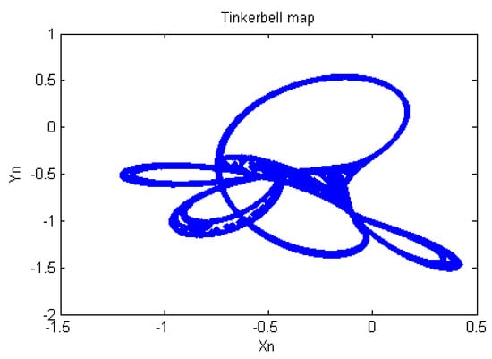 Here, X and Y are the two chaotic Tinkerbell sequences, whereas the constants and are the control parameters which serve as the keys. The initial values (X0, Y0, a, b, c, d) affect the generation of two chaotic sequences []. The attractor of the Tinker bell map is shown in Figure 6.