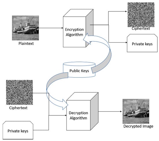 The vulnerability of symmetric cryptosystems to various cryptographic attacks led to the development of optical asymmetric techniques in which encryption and decryption are different. In these algorithms, decryption keys are generated during the encryption process and depend on the input plaintext. Phase truncation and phase reservation in Fourier transform (PTFT) was the seminal work in this direction []. However, the relationship between the ciphertext and private key leads the PTFT-based encryption algorithm to be vulnerable to special iterative attacks []. To improve the security of this method, hybrid opto-digital optical cryptosystems have been developed based on mathematical decompositions, such as equal modulus decomposition, random modulus decomposition, unequal modulus decomposition, polar decomposition, QZ decomposition, elliptic curves and many other operators [,,,,,,,,]. This integration of mathematical decomposition with optical techniques is very effective in designing the sophisticated optical cryptosystems which are robust to various attacks. Some of these are discussed in detail in the following sub-sections. A general flowchart of an asymmetric cryptosystem is shown in Figure 7.