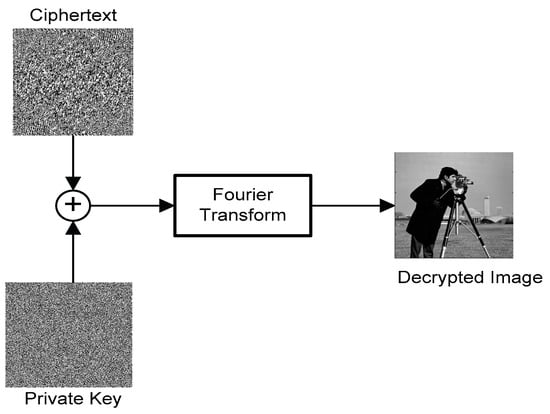 Step 1: The private key and ciphertext are combined and propagated through the Fourier transform. Mathematically, the decryption process is discussed in Equation (12). Figure 9 depicts the schematic flowchart of the decryption process of the PTFT-based cryptosystem.