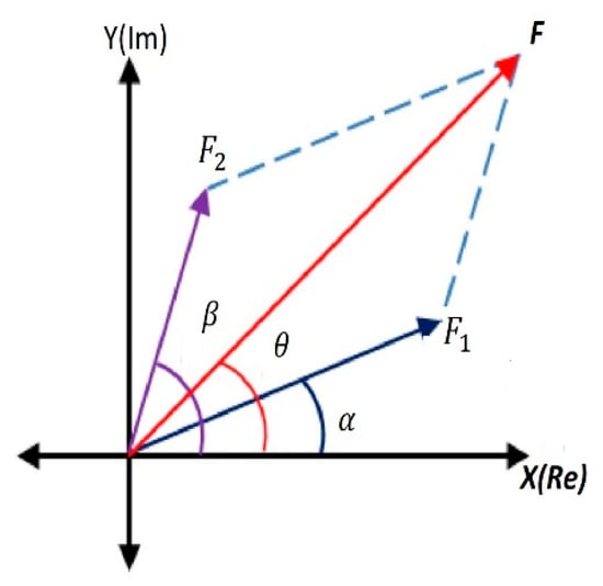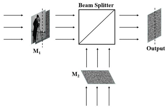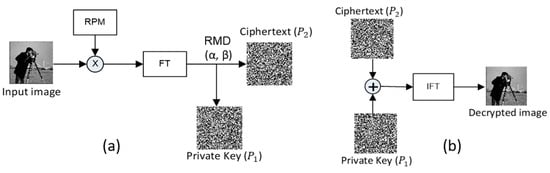 In random modulus decomposition (RMD), unlike in the EMD, the input signal is decomposed into two unequal random moduli. Suppose is the input image scrambled with a random phase mask (RPM) and propagated through the Fourier lens. The output obtained in the Fourier transformed signal is decomposed into two parts, and , by virtue of random modulus decomposition, as illustrated in Figure 12. The flowchart of the basic cryptosystem based on RMD is depicted in Figure 13 [].