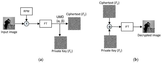 This is a decomposition technique that divides a one- or two-dimensional signal into two signals having unequal phases and amplitudes. The unequal modulus decomposition is unlike that of the EMD or RMD and decomposes the input signal into two unequal moduli. Suppose is the input image that is diffused with a random phase mask (RPM) and propagated through the Fourier lens. The output obtained in the Fourier transformed signal is divided into two parts, and , by virtue of unequal modulus decomposition, as discussed in Figure 14. The flowchart of a basic cryptosystem based on UMD is depicted in Figure 15 [,,,]. Mathematically,