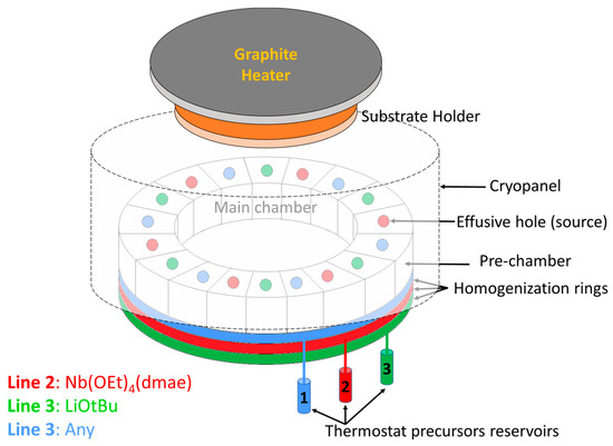 Schematic of the CBVD/CBE Sybilla 200 system from ABCD Technology used in LiNbO3 thin film studies. Li precursor is located on line 1, and Nb is located on line 2. A thermostatic reservoir is employed to evaporate every precursor into a pre-chamber ring that is connected to 6 compartments with effusive holes on top. Through line-of-sight trajectories from the Knudsen holes, the precursor molecules reach the substrate and decompose due to the substrate heating.