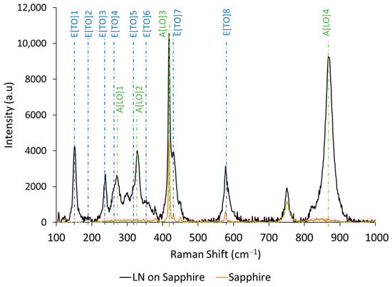 Raman spectroscopy is applied to estimate the chemical compositions of films. According to the difference in active scattering modes, the LiNbO3, LiNb3O8 and Li3NbO4 phases can be identified [43]. In this study, a Raman system was used at 633 nm laser wavelength with a lens magnification ×100. The Raman spectra of LiNbO3 film on sapphire and sapphire substrate spectra are presented in Figure 2. Peaks were measured at 152, 238, 270, 328, 428, 578 and 870 cm−1, which correspond to the expected modes of bulk LiNbO3 [44]. The vibrational modes of LiNb3O8 and Li3NbO4 could not be observed.
