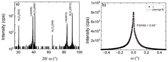 (a) High-resolution X-ray diffraction diffractogram 2θ/ω scan of LiNbO3 from 15° to 100°, and (b) rocking curve on LN (006).