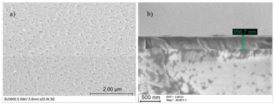 The thickness measured in the SEM cross-section (see Figure 5b) was approx. 357 nm, and the growth rate equaled 119 nm/h.