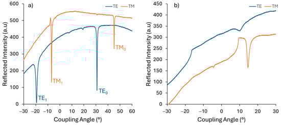 Guided-mode spectrum obtained by measuring the reflected intensity versus the angle of incidence in TE and TM polarization at different light wavelengths: (a) 636.6 nm and (b) 1548.4 nm.