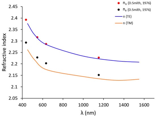 The general equation is given as Equation (3), as follows, and the equation parameters are described in Ref [54], where the index e means extraordinary and the index o ordinary, with cLi in mol % Li2O, λ in nm, T in °C and T0 = 24.5 °C: