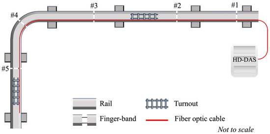 Figure 4 provides a schematic illustration of the experimental system. The track configuration includes two straight segments and a curved track. The rail beams are joined by five finger-band connectors, with turnouts between the #2 and #3 finger-band joints following the #5 finger-band joint. The fiber optic cable is terminated at its leading end with the HD-DAS system, while the trailing end is extended to the terminal point of the track.