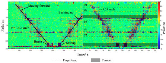 Moreover, the waterfall plots facilitate identifying and localizing specific track features, such as finger-band joints and turnouts. And, due to the #4 finger-band’s location at a curve, there is a certain level of noise response in the vicinity of this area, which is inferred to be caused by the structural connections of the curve. Analyzing the distinctive patterns in the vibration signals makes it easy to identify these track structures’ presence and location.