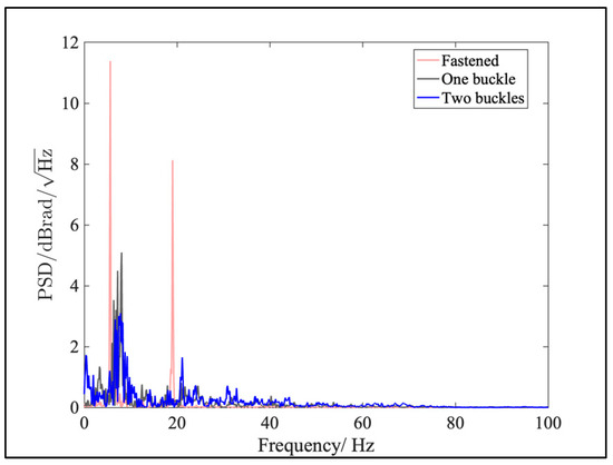 By analyzing the Power Spectral Density (PSD) of the vibration signals generated during the train’s passage over the finger-band, as shown in Figure 9, it can be seen that the predominant vibration frequencies are concentrated below the 100 Hz threshold. This observation is corroborated by the previous discussions, which categorized the primary frequency bands of the vibration signals into two distinct intervals, 0–20 Hz and 20–50 Hz. Furthermore, the effect of finger-band loosening on the signal is more pronounced in the 20–50 Hz frequency band. This way, 20–50 Hz is treated as the characteristic frequency band.