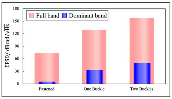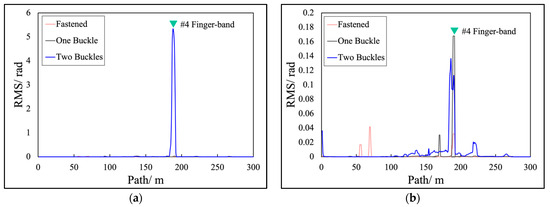 To further analyze the energy characteristics of the vibration signals, we analyzed the time-domain signals when the train passed over the #4 finger-band, calculating the root mean square (RMS) of the vibration amplitudes, as depicted in Figure 11. A distinct increase in RMS is observed following the loosening of the finger-band. As shown in Figure 11a, when the finger-band is loosened by one buckle across the entire frequency range, there is no significant increase in RMS. However, when loosened by two buckles, the RMS value sharply increased.