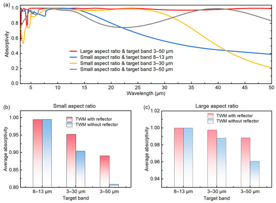 Optimized spectral performance of the TWM absorber. (a) The absorption spectra of the proposed TWM for different aspect ratios and target bands. Average absorptivity for small (b) and large (c) aspect ratio TWM absorbers.