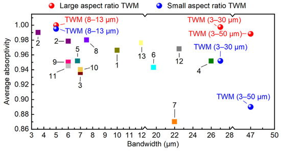 Performance comparison of representative broadband metamaterial absorbers in the IR regime. The typical broadband metamaterial absorbers reported in references are marked with numbers 1–13 (details see Table S2).