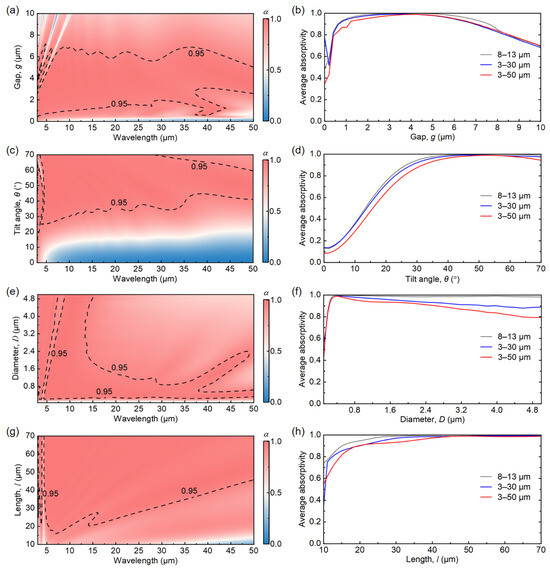 The geometrical parameters were optimized by the particle swarm optimization (PSO) algorithm [64] to maximize the average absorptivity aiming at wavelength regions of 8–13 μm, 3–30 μm, and 3–50 μm. We created optimization tasks using FDTD Solutions software’s built-in PSO algorithm. The average α is defined as figures of merit. The maximum generations, generation size, and tolerance are set to 50, 12, and 0, respectively. For the small aspect ratio (l/D) TWM, the ranges of the wire’s gap g, tilt angle θ, diameter D, and length l are set to 0–10 μm, 0–70°, 1–6 μm, and 0–10 μm, respectively. For the large aspect ratio TWM, the ranges of the wire’s gap g, tilt angle θ, diameter D, and length l are set to 0–20 μm, 0–70°, 0.2–10 μm, and 0–60 μm, respectively. We also ran a parameter sweep based on FDTD Solutions to verify the accuracy of the PSO results and investigate the effect of the geometry parameters on spectral performance. When sweeping the specific parameter values, other parameters maintain the optimal dimensions obtained by the PSO algorithm. During and after running the PSO algorithm and parameter sweep, no error messages should be displayed, and the “Auto shutoff” value should be less than 1 × 10−5.