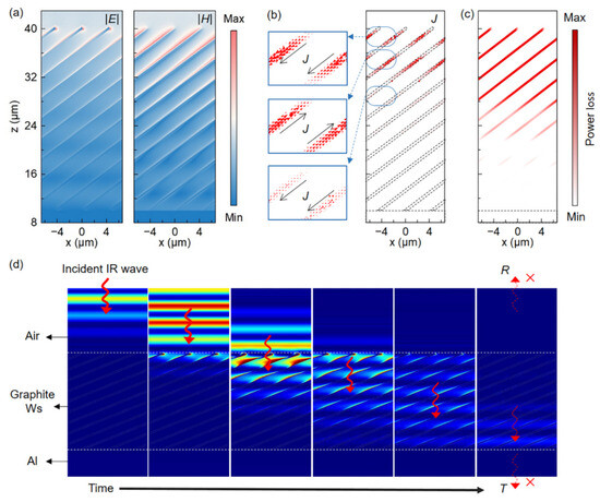 To further understand the physical mechanism in the proposed ultra-broadband absorber, we calculated the distributions of the electromagnetic field, the current density, and the power loss for the TWM structures, as shown in Figure 6. We calculated them at a representative wavelength of 10.8 μm, where the proposed structure shows a peak absorption of approximately 1. Apparently, strong resonant electromagnetic coupling occurs between tilted neighboring wires and is mainly distributed on the top surface of the wires (Figure 6a). The direction of the induced current density vector mainly flows along the radial direction of the wires, and the intensity decreases from top to bottom (Figure 6b). Furthermore, the energy loss distribution coincides precisely with the location where the currents accumulate, indicating that the perfect absorption of the graphite-based TWM absorber originates from ohmic loss (Figure 6c). We also captured the time-domain dynamic distribution of the electric field to vividly perceive the electromagnetic wave coupling of our TWM absorber (Figure 6d). When IR light propagates from top to bottom, it is strongly confined around the surface of the wires and primarily dramatically dissipates at the upper part without transmitting and near-zero reflecting. Therefore, we can confirm that the ultra-broadband absorption of the TWM structure mainly arises from the strong electromagnetic coupling resonant induced by neighboring tilted graphite wires.