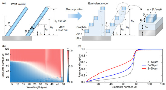For a comparison, we proposed a typical three-layer equivalent model to clearly elucidate the advantages of our TWM structure. We decomposed the entire graphite wires into smaller elements with a quantity of m, each containing a square graphite resonator, air insulator, and Al reflector (Figure 7a). The equivalent model is analogous to a well-known MIM configuration with multi-sized insulator resonant cavities (the thickness is denoted as hm − D/2) to achieve the same ultra-broadband absorption as the TWM structure. The simulated results show that the absorption spectrum of the equivalent model gradually increases with the increasing number of divided elements m (Figure 7b,c). Achieving excellent absorption performance (e.g., the average absorptivity > 0.97) at 3–50 μm requires more than 84 resonant cavities of different sizes, which indicates a more complicated structure than the TWM structure. Therefore, we can demonstrate that our proposed TWM structure possesses unprecedented properties, including a simple structure, high absorptivity, and ultra-broadband bandwidth.