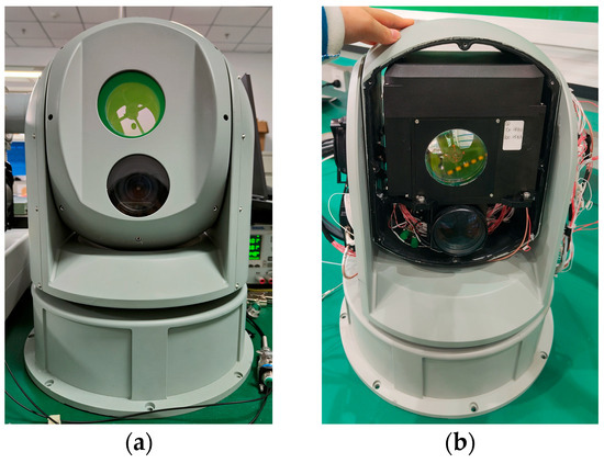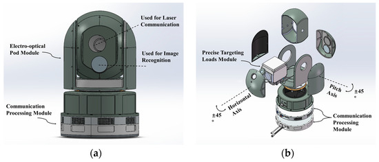 Design of the high-precision FSO communication system for mobile platforms. The precise targeting load module is located in the spherical turret of the electro-optical pod module. The spherical turret has image recognition, can be rotated ±45° around the horizontal axis, and covers ±45° of field of view in the pitch flat. (a) Overall appearance of the system. (b) Explosion view of the system.