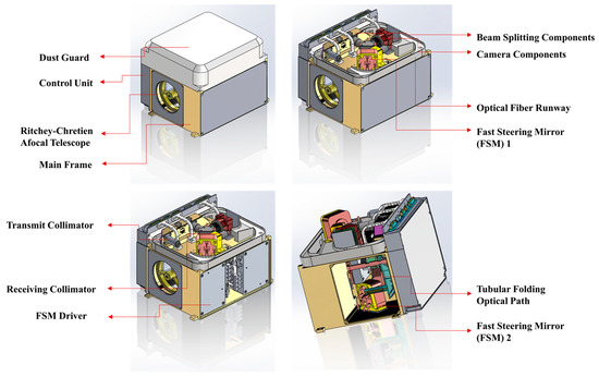 Figure 2 shows the design of the precise targeting load module. The module adopts a transceiver coaxial design. As shown in Figure 3, receiving and transmitting optical paths share a primary mirror system, and they are separated and coupled through dichroic mirrors. The design of the primary mirror system is shown in Figure 4a using the Ritchey–Chretien (R–C) afocal telescope. Figure 4b shows the design of the tubular folding optical path inside the module. All optical components are folded around the R–C primary mirror, effectively reducing the volume and weight of the load.