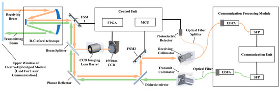 The R-C primary mirror is coaxial with the upper window of the electro-optical pod, which is used for optical communication (shown in Figure 3). R-C telescope system concentrates on receiving beam and diverges transmitting beam. Both FSM and planar reflectors are used to turn optical paths. In addition, FSM can adjust the direction of the optical path. Dichroic mirrors are highly reflective of the receiving beam and highly transparent to transmitting light. A beam splitter separately divides a part of receiving light to CCD for collecting spot offset. The control unit will adjust the deflection angle of FSM1 (precise sight) and the deflection angle of the electro-optical pod (coarse sight) according to this spot offset.