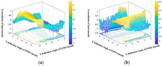 Spot coordinates obtained when FSM1 scans the entire camera field of view in periodic motion; below the surface is a contour line of spot coordinates. (a) Spot x-coordinate surface plot. (b) Spot y-coordinate surface plot.