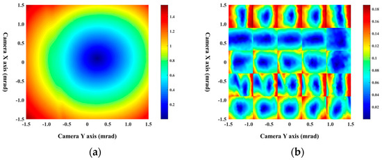 Therefore, we can use the parameter array to describe this deviation. In addition, since the spot deforms at the edge of the camera, the deformation can also be corrected according to the coordinate translation and rotation. Hence, we block the camera’s field of view, and each module uses a different array of parameters to correct for errors caused by translation, rotation, and distortion. In the case of an external light source, we control the FSM1 to carry out two-dimensional periodic motion in small steps to scan the entire field of view of the camera. As shown in Figure 7, we will obtain the spot coordinates that correspond one-to-one to the FSM1 coordinates, which are calculated from the spot information collected by the camera. The parameter array of error correction can be obtained after nonlinear curve fitting for the data of different modules. During the tracking process, we will use the FPGA in the control unit to calculate corrected spot coordinates in real time through the correction array, which will correct the positioning bias of the camera. As shown in Figure 8, after correcting the spot coordinates collected by the camera, the positioning error of the camera edge is greatly reduced, and the positioning overall error of the camera is reduced by one order of magnitude. In the above way, we completed the coaxial calibration of the camera system for beam positioning. Thus far, the coaxial debugging of the whole system has been completed.