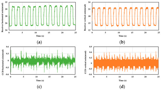 Horizontal and vertical data are measured simultaneously in tracking experiments between moving platforms. (a) Horizontal direction of receiving device. (b) Vertical direction of receiving device. (c) Horizontal coordinates of spots collected by CCD. (d) Vertical coordinates of spots collected by CCD.